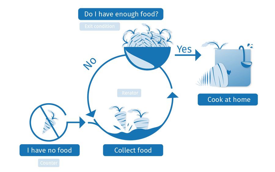 • 一種條件,它是對/錯測試,用於確定循環是繼續運行還是停止(通常在計數器達到某個值時)。 「我是否有足夠的食物?」對此進行了說明。 以上。 假設他需要 10 份食物來養家糊口的話。